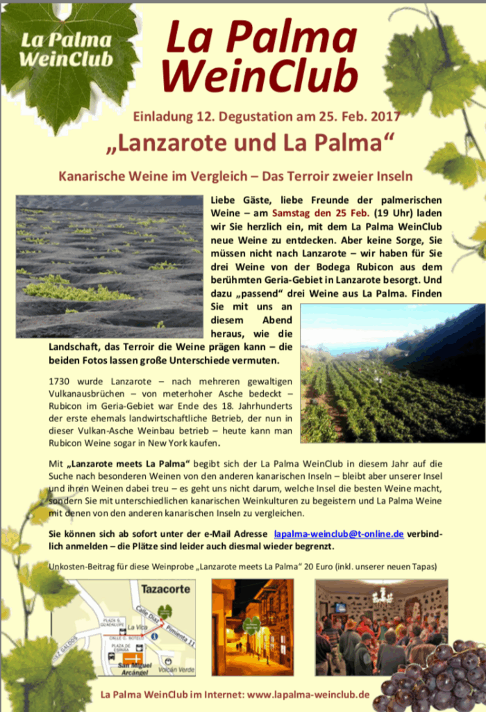 Lugar: La Palma Wein ClubFecha y hora: 25 de Febrero a las 19:00hInscripción: lapalma-weinclub@t-online.dePrecio Degustación + Tapas: 20€ Degustación der